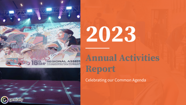 We are pleased present to you the ICA Asia-Pacific Annual Activities Report for 2023. We had a successful year highlighted by events like the 16th Regional Assembly and the 11th Cooperative Forum in Manila, focusing on Cooperatives: Our Common Agenda. The fourth Asia-Pacific Cooperative Youth Summit in Sabah emphasized youth's role in sustainability discussions. Awards were given to outstanding cooperatives and researchers, and four new members joined our cooperative family. Training initiatives, partnerships, and workshops continued to strengthen cooperative development, with a focus on gender equality, digital inclusion, and sustainable practices. Our collaborations with existing and new organizations have contributed to our shared goals. We extend our gratitude to all our partners and members for their support and collaboration.
