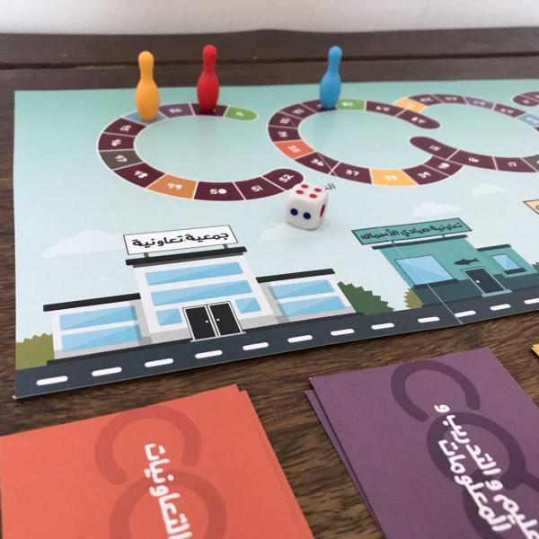 "Ta'awon" is an educational game that markets the new cooperative logo " coop " and the principles of co-operatives. The idea of this game is very simple and straight forward. The players can move forward until they stand on a coloured box that determines the colour of the card; each colour stands for one of the seven cooperative principles. Each card contains a right or wrong statement about the principle, and an order that makes you go back or go forward. The player then pulls the cards, reads it, then carries out the order on it. For example, the first principle is “Open Membership”, one of the card states that "you registered on your choice after you knew about the invitation to become a coop member” which is a right action, so the card orders you to move one step forward.