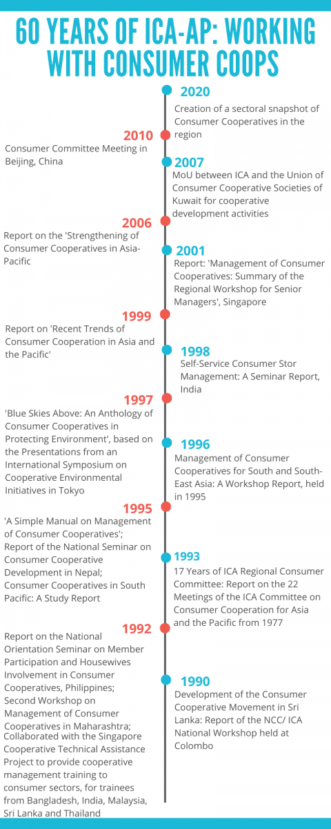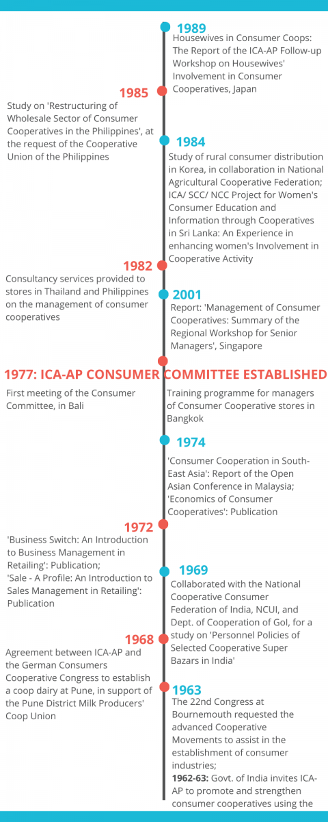 The timeline below provides a brief overview of ICA-AP's involvement with consumer cooperatives in the region, to promote and enhance development of consumer cooperatives.