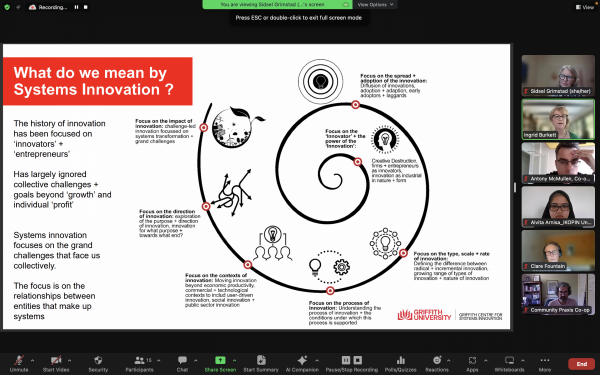 Dr. Sidsel Grimstad, a senior lecturer at Griffith Centre for Systems Innovation (GCSI), Griffith University led the presentation. The GCSI is a centre within Griffith Business School, with an aim to accelerate transitions to regenerative and distributive economies. She mentioned that we are at a critical juncture of change, challenge, and opportunity. Issues like the climate crisis, inequality, the future of work and ageing populations require innovative solutions. Cooperatives help grow capabilities and infrastructures to meet these challenges in ways that are better for people, places, and the planet. Cooperatives have a unique advantage in their response to these challenges. They are guided by cooperative principles and values including maximising member value and prioritising democratic participation in decision making. Cooperatives produce positive economic, social and environmental outputs for their members and communities. However, there are still questions about how cooperatives can bring about substantial systems change. How can the cooperative sector become a larger and more active player in bringing about systems innovation while maintaining the cooperative identity? How can cooperatives lead the way as innovators, not only for other cooperatives but also for non-cooperative organisations? Is this a way to cement the sector's relevance in a changing global business environment?