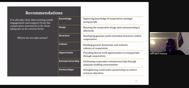 On 26th March 2021, the key findings of the research were discussed by the #coops4dev team in the global workshop on ‘Report Lab: Young People and Cooperatives: A perfect Match?’ conducted during the GYF21. Dr. Sarah Alldred (Co-operative College, UK), Ms. Celina Butali (Regional Gender, Children, and Youth Advisor, Vi Agroforestry, Kenya), and Ms. Angélica Soberanes (President of the Regional Youth Committee for the Americas and Vice President of the ICA Global Youth Network) were the guest speakers of the workshop. Mr. Khabenje presented the findings and Ms. Singh facilitated discussions on youth engagement in cooperatives, the role of education and training, youth advocacy, and an enabling environment to promote youth integration in the cooperative movement with the guest speakers.