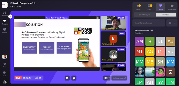 All the 10 finalists made a presentation and answered questions from the judges; they were evaluated based on their live presentations, technology relevance, and cooperative/ collective models. Inno Game Coop from Indonesia grabbed the first position followed by MYCOON and Design for Impact respectively, both from India.