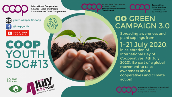 In 2020, Go Green 3.0 was celebrated as World Goes Green, with the Youth Committees of ICA-AP, ICA-Africa and ICA-Americas. Each region has been organising activities in accordance with local requirements. Due to the COVID-19 crisis, this year the network encouraged participants to plant trees at home or their workplace. ICYC organised an international webinar on Youth Cooperatives for Climate Action on 7th July to commemorate the International Day of Cooperatives (IDC) on 4th July. The theme for this year’s IDC was Cooperatives for Climate Action in support of Sustainable Development Goal (SDG) 13: Climate Action.
