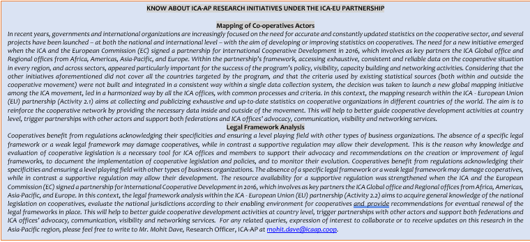 As people-centered businesses, co-operatives are owned and run by their members, who have an equal say in what their organization does and how it generates and uses profits. Co-operatives are a tried-and-tested model in international development, enabling people around the world to take control over their livelihoods. In March 2016, the International Co-operative Alliance entered into a partnership with the European Commission, ushering in a new phase of collaboration on strengthening the co-operative movement as development actors. The ICA-EU partnership on Co-operatives in Development (#Coops4Dev) aims to bring the co-operative model to the next level within international development policies and programs. It is built around activities focused on increasing visibility, enhancing advocacy, sharing capacity building, strengthening co-operative development networking, and supporting all these with evidence from exhaustive research. The regional and global offices of the ICA are driving the actions, in collaboration with members, civil society organizations, international institutions and the EU. The AP unit of the #Coops4Dev has identified the following three strategic development priorities to implement the project 1. Participation of Co-operatives in Agenda 2030 for Sustainable Development (SDGs), 2. Inclusion of Youth in Co-operatives 3. Explore Work & Ownership Structures in Co-operatives; and two cross-cutting development priorities namely a. Gender Equality b. Climate Action.