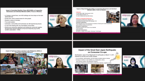 The first session focused on natural disasters such as the Great East Japan earthquake (2011), bushfires and floods in Australia (2020), typhoons Vamco and Goni in the Philippines (2020) and Nepal earthquake (2015). Senior women cooperators - Ms. Chitose Arai, Acting Chairperson of the ICA-AP Committee on Women, ICA-AP Board member, and Vice-Chairperson of Japanese Consumers’ Cooperative Union (JCCU); Ms. Melina Morrison, CEO of Business Council of Cooperatives and Mutuals (BCCM), Australia; Ms. Joselita Cardona, Treasurer of Philippines Cooperative Center (PCC) and board member of National Confederation of Coop (NATCCO), Philippines; and Ms. Chitra Subba, General Manager National Cooperative Federation of Nepal (NCFN) highlighted the collective actions taken by their organisations to help cooperatives recover from physical and monetary losses, and build their short and long-term capacities to address the disasters.