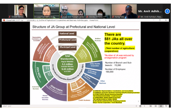 The closing ceremony, held on 16 December was attended by Mr. Toshihiko Baba (video message), Senior Executive Director, Central Union of Agricultural Cooperatives (JA Zenchu); Mr. Hirofumi Kobayashi, Executive Director, IDACA; Mr. Balasubramanian Iyer, Regional Director, ICA-AP; guests from JA Zenchu, Ms. Yuki Irisawa, Course Coordinator, IDACA; Ms. Eiko Oshita, IDACA; Mr. Ashok Taneja, Advisor, ICA-AP; Ms. Shivali Sarna, Lead – Communication & Membership Development and Education and Course Coordinator, ICA-AP, and participants of the training course.
