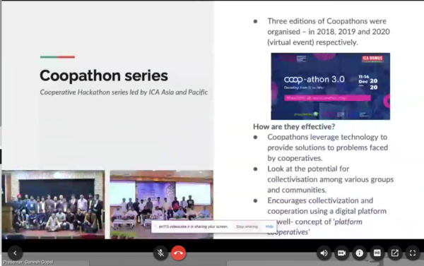 Mr. Ganesh Gopal, Lead – Entrepreneurship Development, represented ICA-AP and delivered a presentation on ‘Cooperative Entrepreneurship: Interventions and Examples from ICA-Asia & the Pacific.’ He spoke about the experience of cooperatives from the region including the concept of ‘participative capital’ and how cooperatives have been instrumental in the equitable distribution of wealth, solving problems faced by local communities, and their role in bringing about economic prosperity and sustainable development.