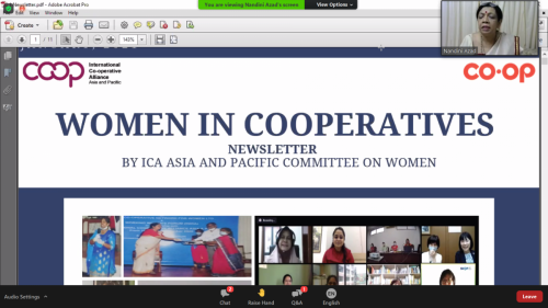 Dr. Azad shared an overview of the ICA Asia and Pacific Committee on Women and activities undertaken by the Committee during the pandemic. These included, 1) a virtual regional webinar to discuss the impact of COVID-19 on women in cooperatives in Asia and Pacific, and 2) the training of trainers’ program on Digital Financial Inclusion of Women Cooperators at the grassroots in India, organised in partnership with the Working Women’s Forum (WWF), Indian Co-operative Network for Women (ICNW) and with the support of Japanese Consumers’ Co-operative Union (JCCU). Nandini added that for a just recovery post COVID-19, there is a need to address the patriarchal mindset in cooperatives, promote women-based cooperatives, and promote women’s voice and participation in decision-making at all levels of cooperatives.