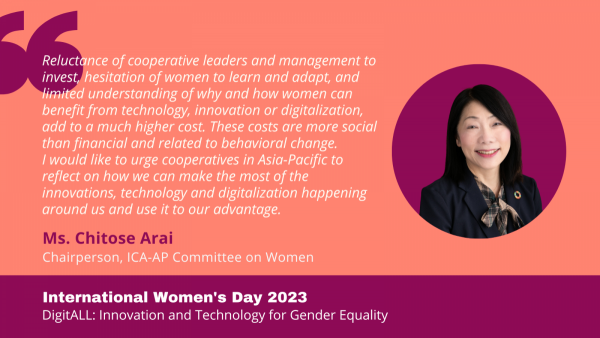 In the context of my message here, we held an online lecture on 7 March to understand why digital inclusion is important for women in cooperative businesses; is digital inclusion enough to make women feel empowered; and how we can protect women’s rights and safety in the digital spaces. The insights shared in the lecture have given us all food for thought and ideas for future action. I strongly believe in the saying that “Where this a will, there is a way”. I am hopeful that with my message here, we can work on our collective will towards the agenda of “DigitAll” for gender equality and a brighter future of cooperatives in Asia and Pacific.