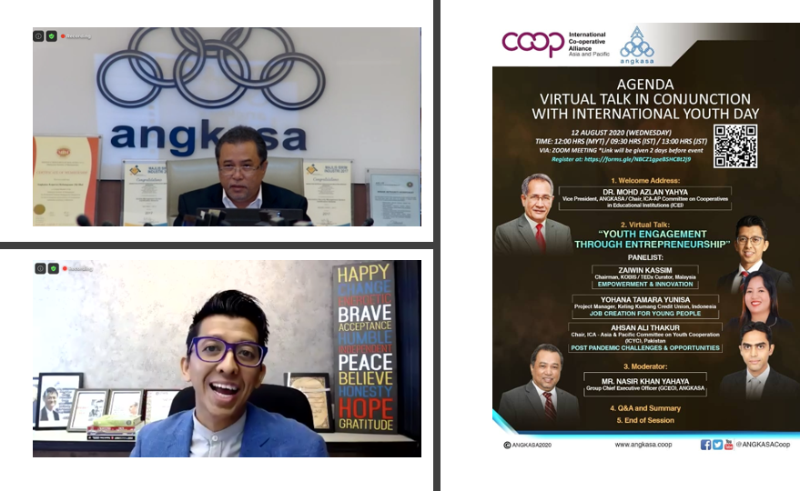 To commemorate the International Youth Day (IYD) 2020, ICA member ANGKASA from Malaysia and the ICA-AP Committee on Cooperatives in Educational Institutions (ICEI) organised an international virtual talk on Youth Engagement through Entrepreneurship. Three young speakers from Indonesia, Malaysia and Pakistan were invited to discuss issues concerning youth, such as job creation; empowerment and innovation; and challenges and opportunities for youth post COVID-19 pandemic.