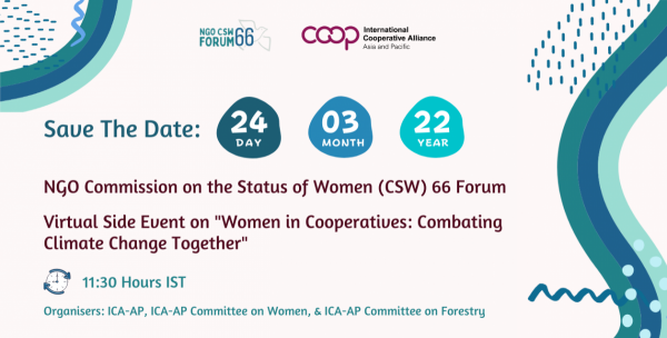 ICA-AP in collaboration with its Committee on Women and Committee on Forestry is hosting virtual side event on ‘Women in Cooperatives: Combating Climate Change Together’ on 24 March 2022 from 11:30 am to 1:30 pm Indian Standard Time (IST).
