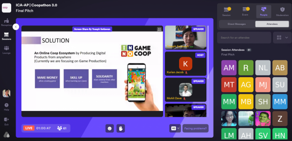 All the finalists made a presentation and answered questions from the judges and were evaluated based on their live presentations, technology relevance, and cooperative/ collective models. Inno Games Coop, Indonesia; MYCOON, India; and Design for Impact, India were declared as the first, second, and third winners, respectively. Inno Games Coop from Indonesia is working to create an online coop ecosystem by producing digital products like games. The model enables anyone with digital and creative skills to join the platform, learn new courses, find teammates, collaborate, and earn.