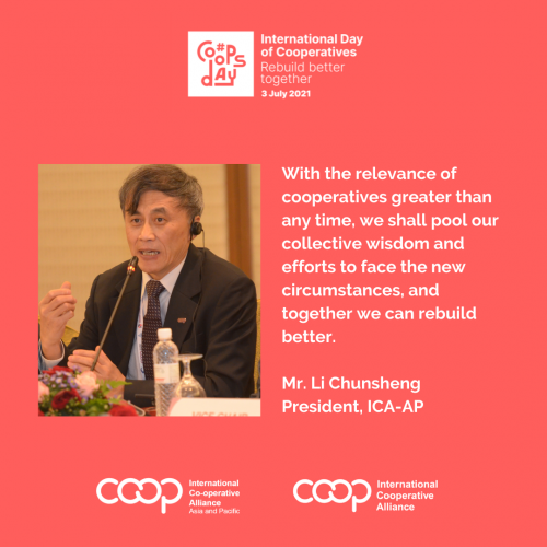 ICA-AP President, Mr. Li Chunsheng congratulating cooperatives on the occasion said, “With the relevance of cooperatives greater than any time, we shall pool our collective wisdom and efforts to face the new circumstances, and together we can rebuild better!”