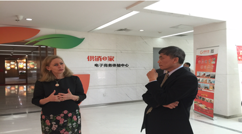 On day four, the first visit was to the office of China E Coop, a national e-commerce platform supported by the All China Federation of Supply and Marketing Co-operatives (China Co-op) that was launched in November 2015. President Li Chunsheng in his introduction said, “the E-Coop was part of China’s Silk Road Economic Belt and 21st Century Maritime Silk Road initiative to promote rural e-commerce and provide cross-border electronic commerce.” As one enters the building, the bright orange logo G welcomes the visitor. The G, apart from being a letter (‘go to buy’) also signifies orange (symbol of freshness and health) and smiling face (to provide customers a pleasant experience). Also displayed in the lobby were an array of well packaged products that could be purchased online. The platform is meant to merge China Co-op’s traditional business and network systems and the internet to serve the rural, agriculture and farmer. The plan is to eventually link all of China Co-op’s 147,297 primary cooperatives, 340,000 rural service centers and 2,406 county level co-operatives to the network.