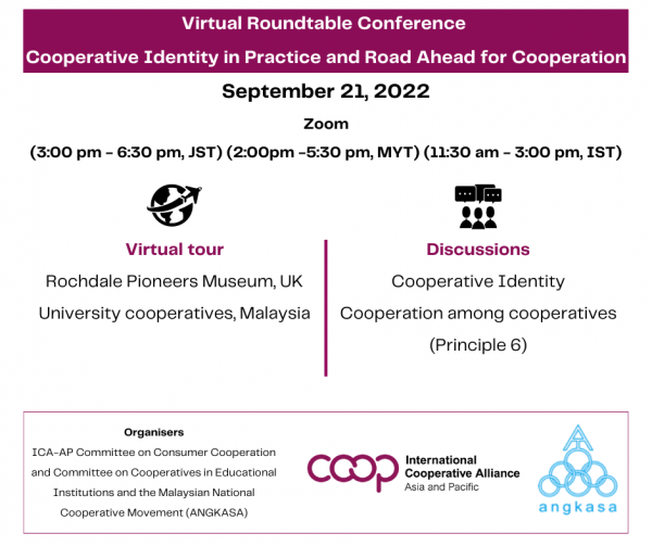 ICA-AP Committee on Cooperatives in Educational Institutions (ICEI), ICA-AP Committee on Consumer Cooperation and ANGKASA, Malaysia will jointly organize the online Roundtable Conference on 21st September 2022.